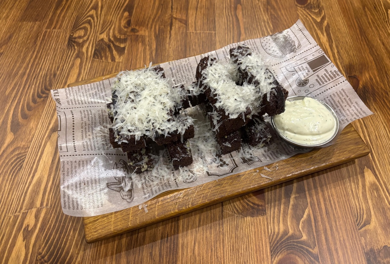 Хрустящие ржаные гренки, обжаренные до золотистой корочки с добавлением нежнейшего тертого пармезана. Подаются с чесночным соусом.
