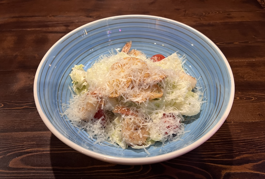 Цезарь с креветкой, салат айсберг, заправка цезарь, нежнейший пармезан