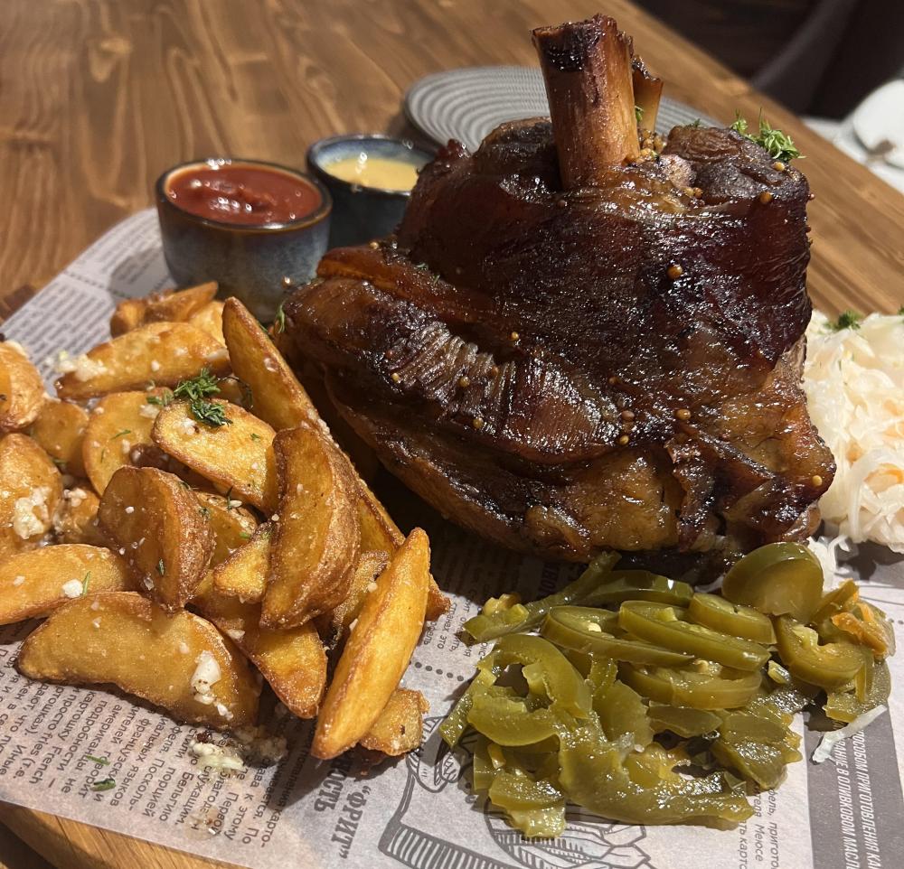 Подается с квашеной капуста, картошкой по деревенски, халапеньо, соусами, Цена за 1 кг, примерный вес от 1 до 1,5 кг. Среднее время ожидания 1,5 часа